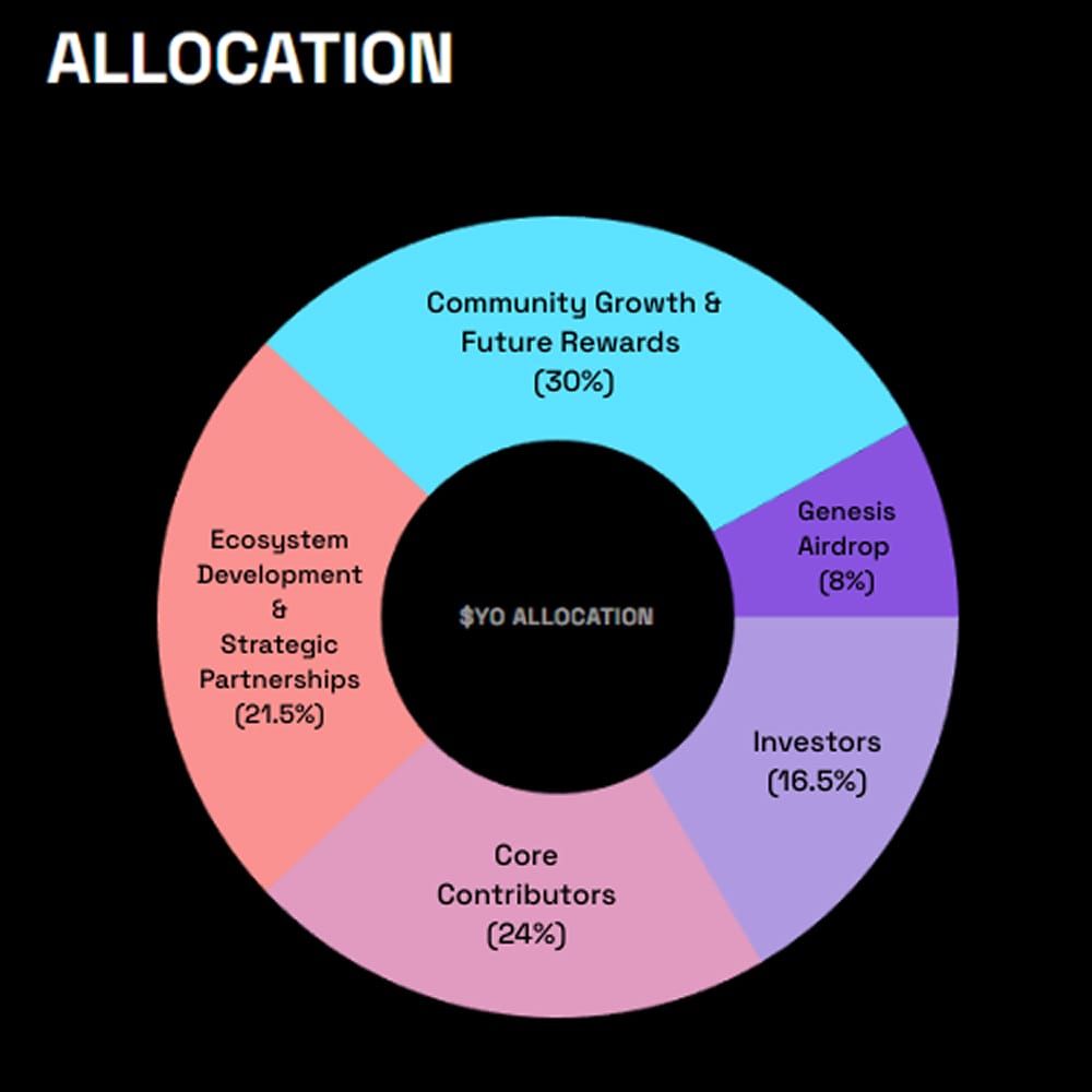 この配布設計により、コミュニティが$YOのガバナンスの中心であり続けることを担保しつつ、プロトコルの持続的な成長に必要な柔軟性とリソースを確保しています。