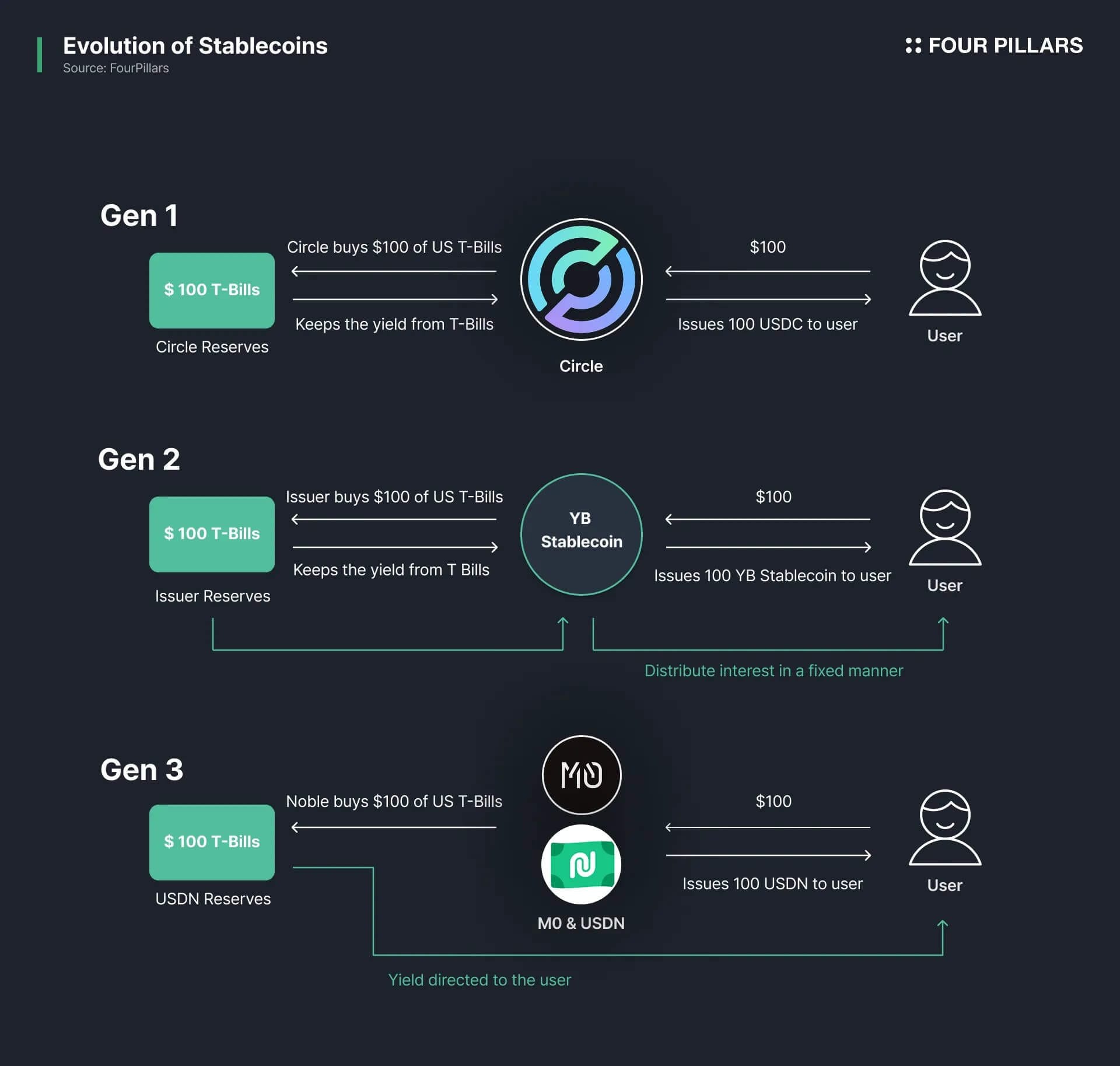- ステーブルコインは、USDCやUSDTのような決済重視の第一世代から、利息分配を導入した第二世代の利回り付きステーブルコインへと進化してきた。では、第三世代のステーブルコインを定義するものは何だろうか?