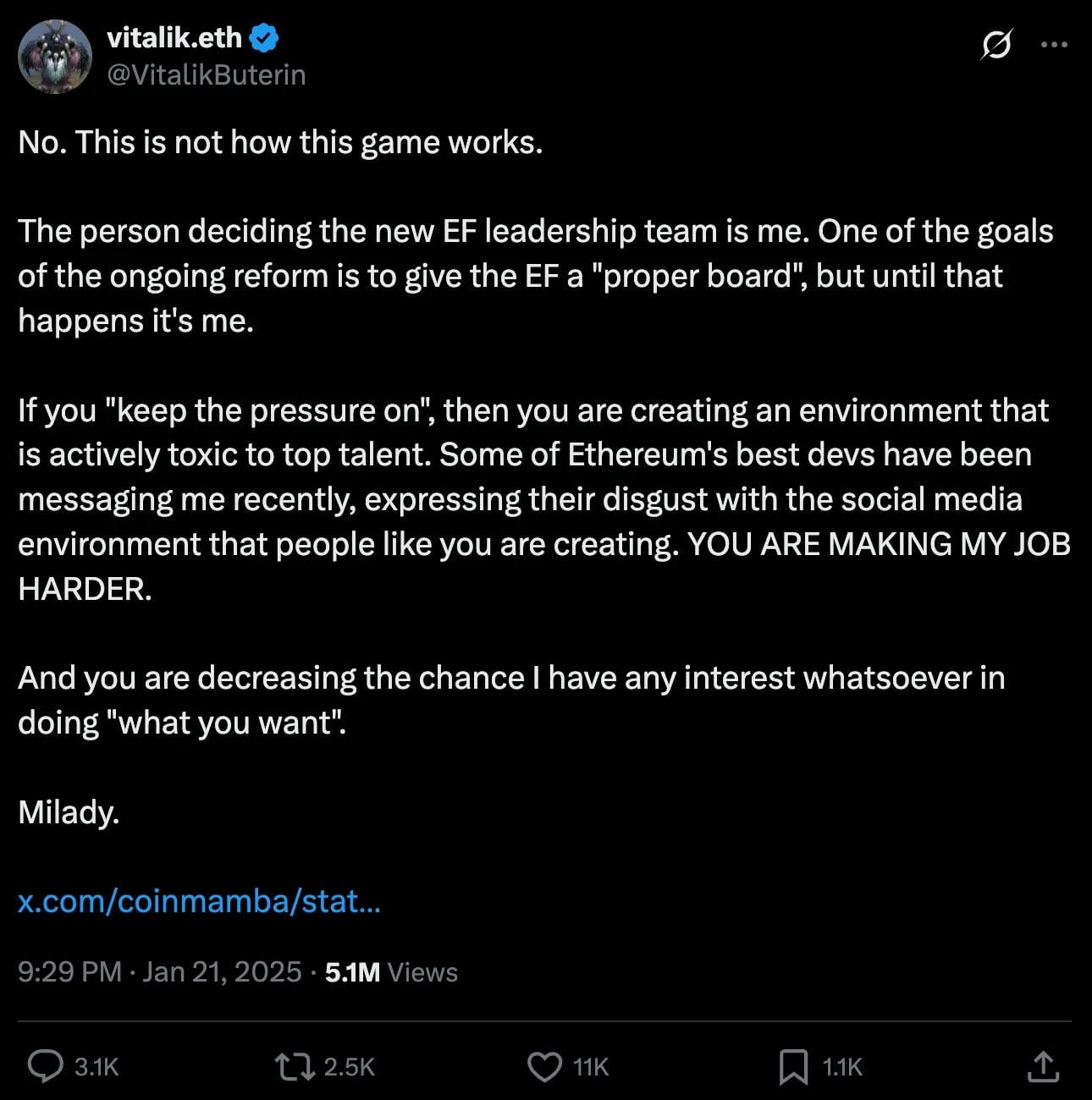 とはいえ、その信念も、中心となる理念がズレはじめると弱まっていく。それはユーザーの間で起こるのではなく、むしろ、リーダーたちの間で起きる。いまEthereumが直面しているのが、まさにこれだ。アップグレードの優先順位をめぐる内部対立、Ethereum Foundation(EF)内のリーダーシップ争い、そして最近では利害関係をめぐる論争。こうした出来事が、かつて一枚岩だったナラティブにヒビを入れつつある。Ethereumは依然として強い文化的求心力を持っているが、方向性の不統一や、中心人物たちが異なる思想的ベクトルを向いているという印象は、「ミッションの迷走」への懸念を確実に高めている。